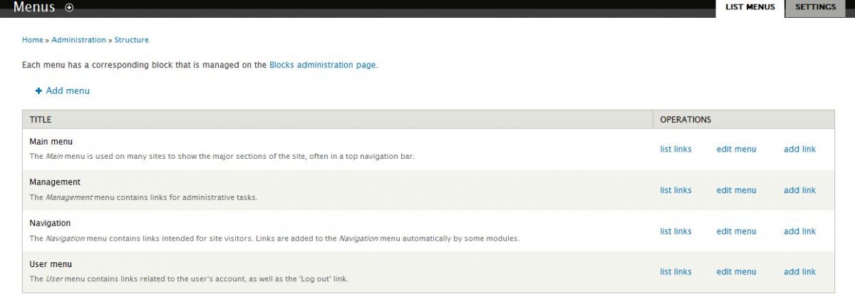Sites typically come standard with these menus: Main Menu, Management, Navigation, and User Menu.
