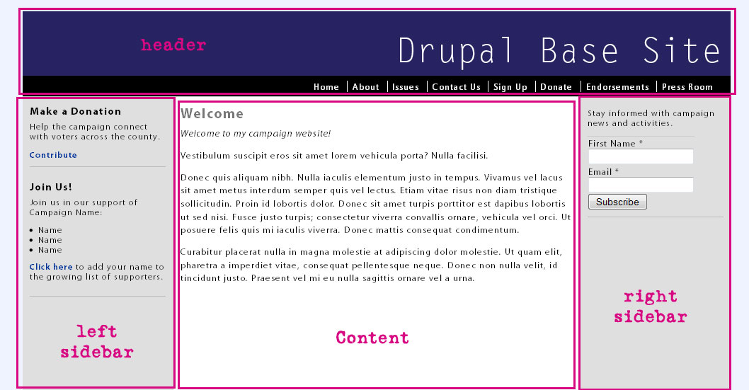 In the above example, you can see there are regions for the header, footer, and sidebars, but also a preface, postscript, and more.